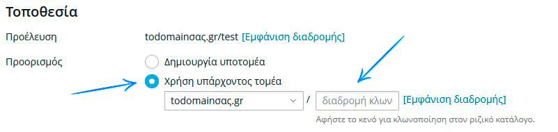 Όταν κάνετε την κλωνοποίηση, επιλέξτε να την αντιγράψετε σε υπάρχον domain (χρηση υπάρχοντος domain ή use existing domain) και αφήστε το πεδίο “path” κενό, όπως φαίνεται παρακάτω: