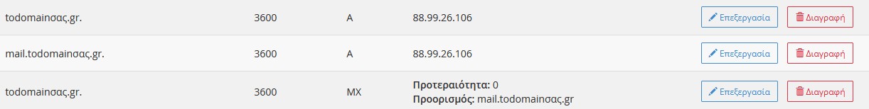 - Αλλάξτε την εγγραφή MX σε MX 0 mail.yourdomain.dk (αντικαταστήστε το yourdomain.dk με το πραγματικό σας domain).
