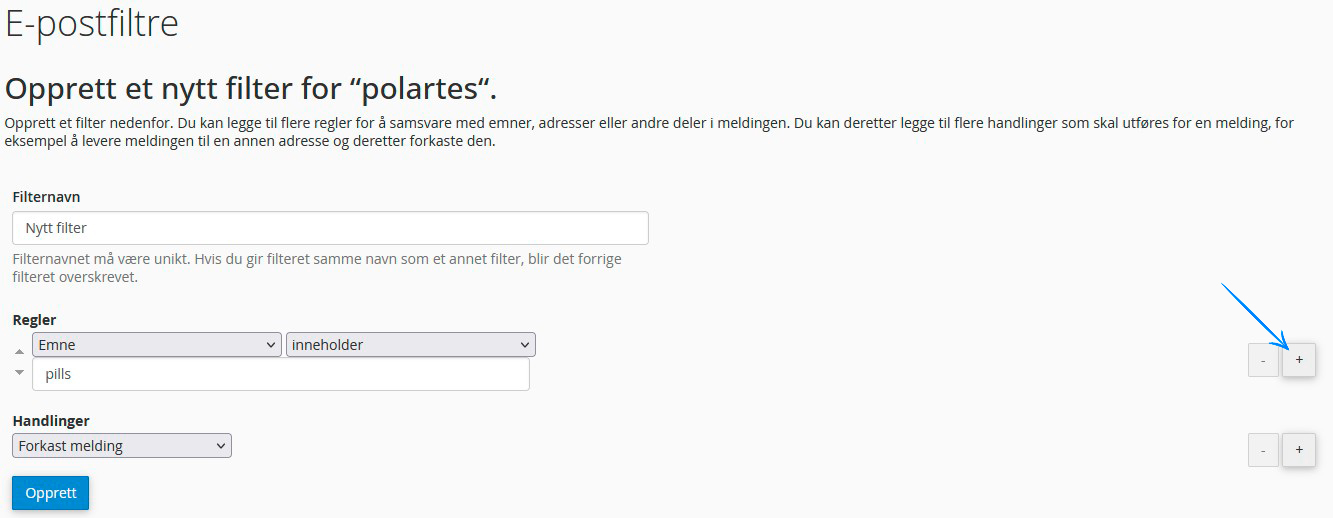 - Hvis du ønsker at flere regler skal oppfylles, kan du klikke på det lille pluss-tegnet, som vist på bildet ovenfor, og legge til flere. For eksempel kan du velge at emnet må inneholde både 'pills' og 'offers' for at det skal slettes.