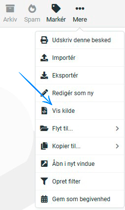 E-postkilden kan for eksempel hentes via webmailen din, hvor du kan klikke Mere->Vis kilde og deretter kopiere kilden og lime den inn i testen, som vist nedenfor.