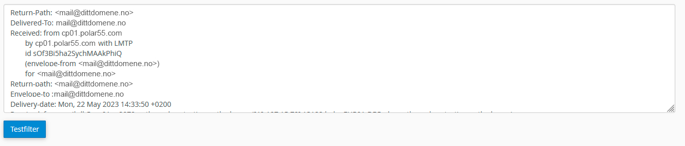 Her kan du ta hele kilden fra e-posten du ønsker å filtrere, kopiere den, og teste om filteret ditt fanger den opp.