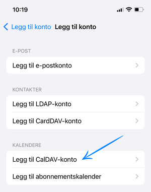 Start med å gå til Innstillinger -> Apper -> Kalender -> Kontoer -> Legg til konto og Legg til CalDAV-konto som vist nedenfor: