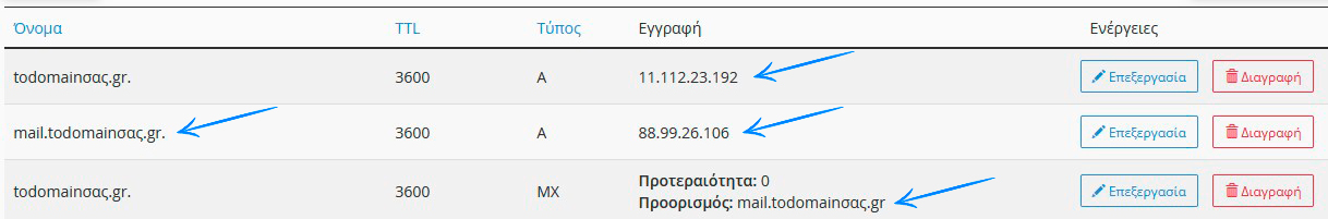 3: Διαγράψτε οποιαδήποτε εγγραφή CNAME που δείχνει προς το mail.tοdomainσας.gr.