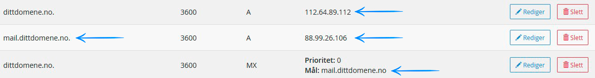 5: Endre MX-postens destinasjon til mail.dittdomene.no (erstatt dittdomene.no med ditt faktiske domene).