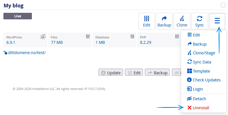 Hvordan slette en eksisterende 1-klikk installasjon, f.eks. WordPress