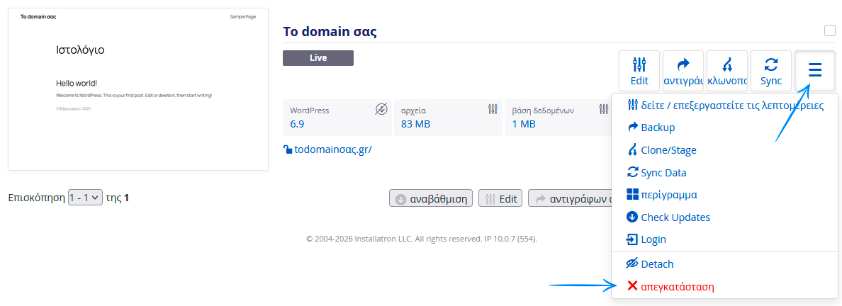 Αν έχετε εγκαταστήσει, για παράδειγμα, το WordPress χρησιμοποιώντας την εγκατάσταση 1-click και θέλετε να ξεκινήσετε από την αρχή με μια νέα εγκατάσταση, μπορείτε γρήγορα και εύκολα να διαγράψετε την υπάρχουσα εγκατάσταση.