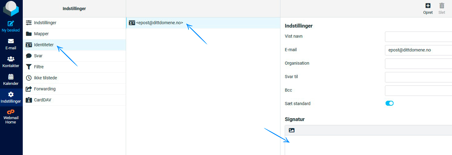 Velg ønsket identitet: Hvis du har flere e-postidentiteter opprettet, velg den hvor du vil legge til en signatur.