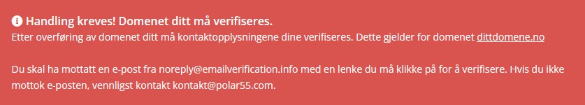 Når du overfører domenet ditt, vil informasjonen din hos vår registrar bli oppdatert basert på detaljene du har gitt oss. Dette kan utløse en "domeneverifiserings"-e-post fra vår registrar. Du vil bli bedt om å klikke på en lenke fra emailverification.info. Hvis du ikke klikker på denne lenken, vil domenet ditt bli suspendert (Domenesuspensjon - Verifisering av registrantinformasjon mislyktes). Ved å klikke på lenken trenger du ikke å fylle ut noe eller ta noen beslutninger. Det er bare en bekreftelse på at informasjonen din er korrekt. E-posten du mottar er veldig enkel i designet og kan forveksles med spam, men hvis lenken går til emailverification.info, er den legitim.