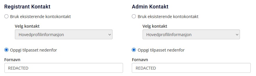 2: Som du kan se, er feltene fylt med "REDACTED FOR PRIVACY." Det kan også stå noe annet, men det er tydelig at det ikke er din informasjon. I dette tilfellet klikker du på "Bruk eksisterende kontokontakt" i alle fire seksjoner. Klikk på "Lagre endringer" nederst på siden når dette er gjort.