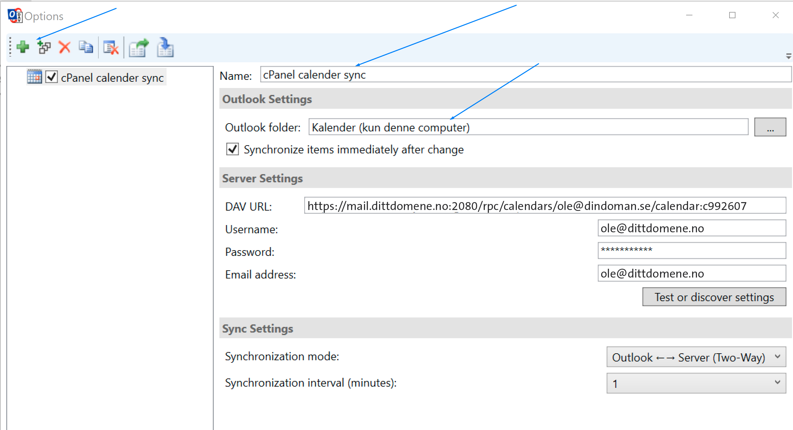 Som DAV-URL, skriv inn "https://mail.dittdomene.no" etterfulgt av ":2080", som blir https://mail.dittdomene.no:2080. Bytt selvfølgelig ut dittdomene.no med ditt eget hoveddomene. Vær oppmerksom på at CalDav Synchronizer i noen tilfeller kan endre "https://mail.dittdomene.no:2080" til en annen URL hentet fra serveren. Hvis dette skjer, bruk URL-en som hentes fra serveren.