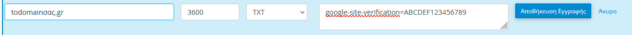 Όταν επαληθεύετε τον ιστότοπό σας στο Google Search Console, πρέπει να προσθέσετε μια εγγραφή TXT, όπως σας υποδεικνύει η Google παρακάτω: