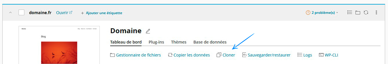 Que vous souhaitiez un site de staging ou simplement cloner votre site vers un nouveau domaine, choisissez l’option « Clone » comme indiqué sur l’image ci-dessus.