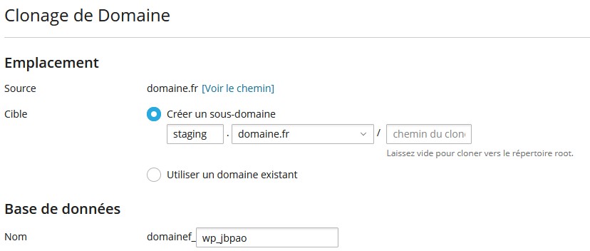 Veuillez noter que si vous choisissez un autre domaine sur votre compte et que vous souhaitez cloner le site directement à la racine du domaine (et non dans un sous-dossier), vous devez laisser le champ « path » vide (il est initialement rempli avec « staging »).
