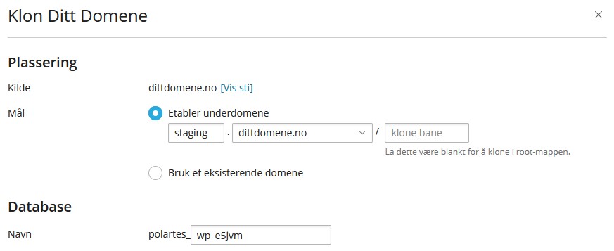 Hos polar55 er det enkelt å lage enten et staging-miljø for nettstedet ditt eller kopiere/klone nettstedet ditt til et annet domene på kontoen din.
