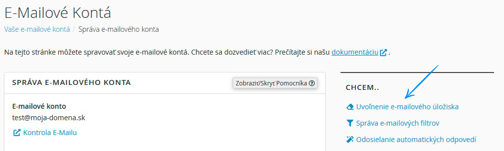 Môžete sa tiež rozhodnúť prihlásiť priamo do svojho webmailu a e-maily mazať manuálne, ale v tomto návode sa zameriavame na funkcie dostupné po kliknutí na Spravovať pri e-mailovom účte, konkrétne na "Uvoľnenie e-mailového úložiska", ako je zobrazené nižšie.